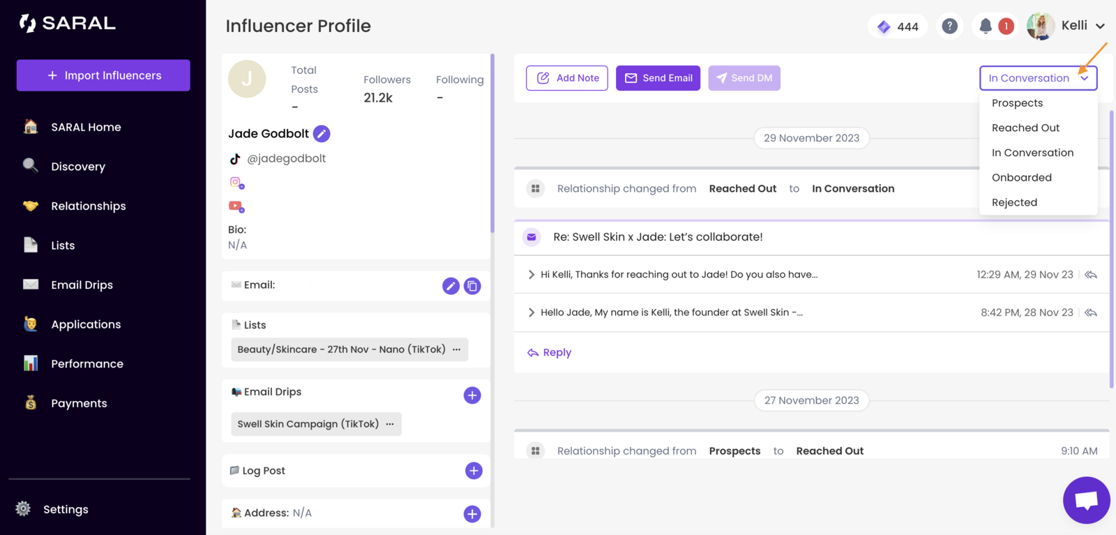 The Influencer status reflects the current stage of your conversation with each creator. As covered earlier, you can monitor and manage these within the Relationships CRM board in your SARAL account.