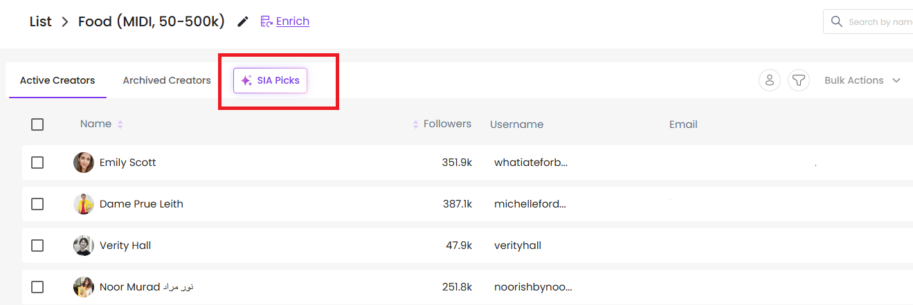 The SIA Picks feature proves invaluable when you're ready to scale your influencer marketing program. Once you've added a solid base of influencers to a list — ideally 5 to 20 or more based on your Ideal Customer Profiles (ICPs). You can use this tool to discover 100s of similar creators in seconds.