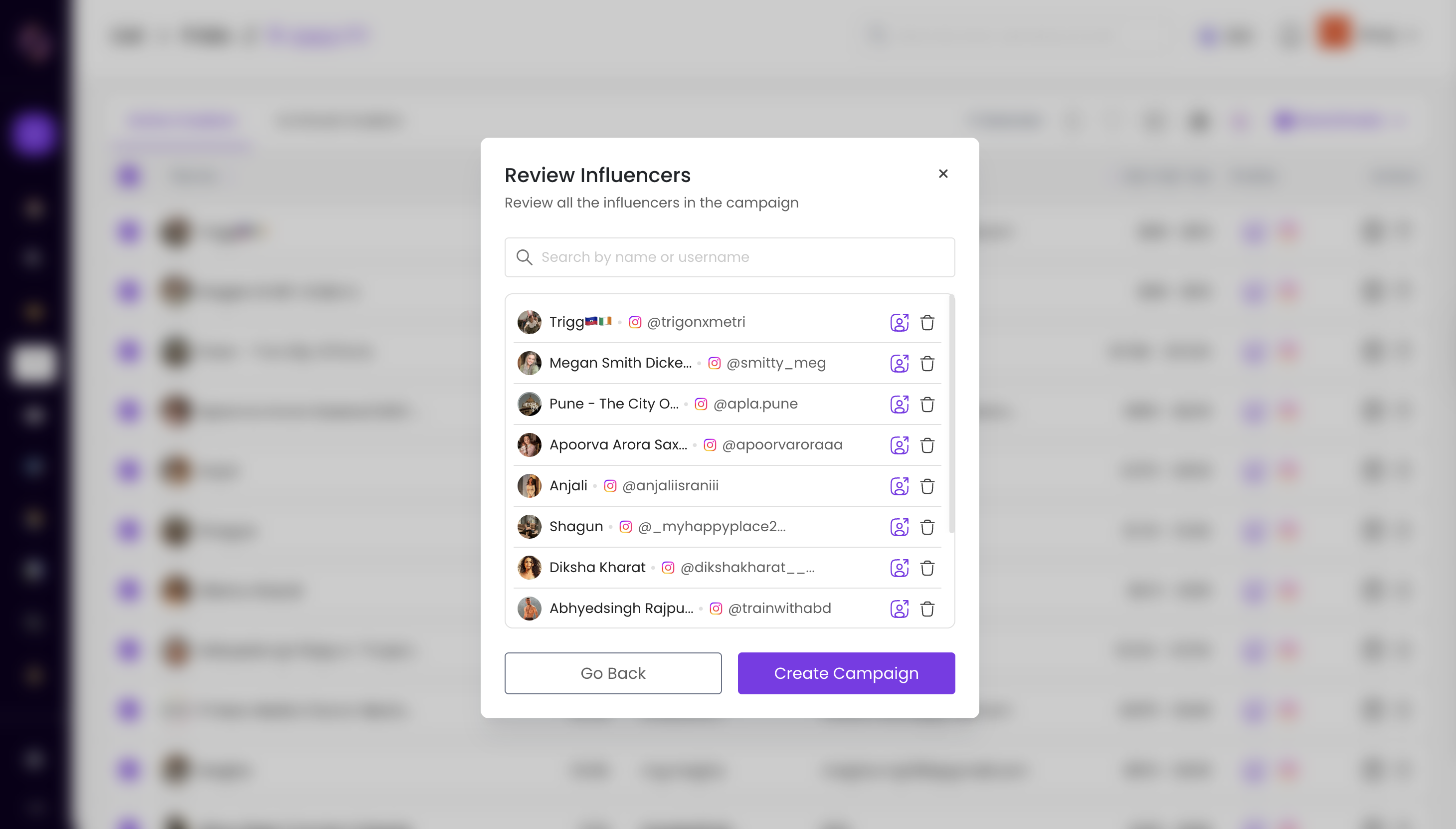 Select the influencers from that list you want to add to a campaign.. Once selected, a bulk-action menu icon will appear on the top-right.