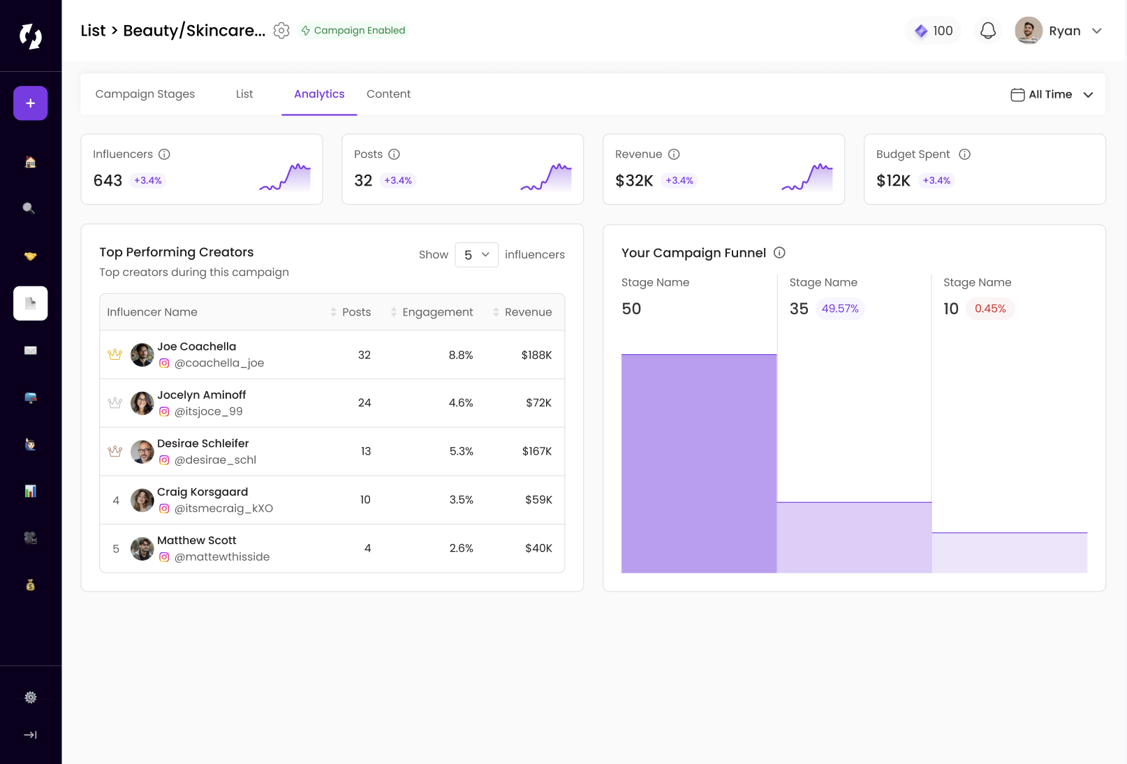 Top Performing Creators: Shows top performing creators of your campaign ranked by revenue, engagement rate.