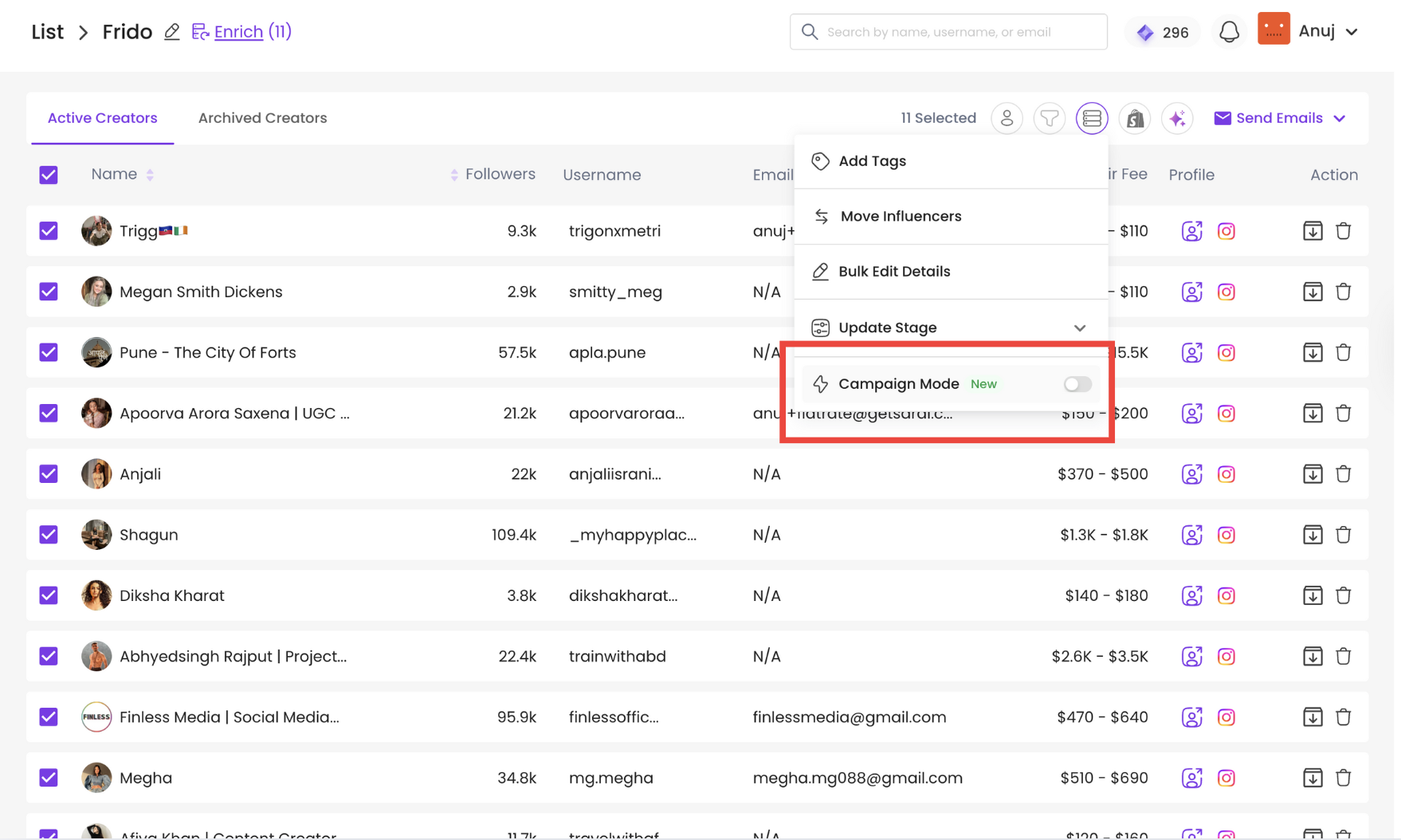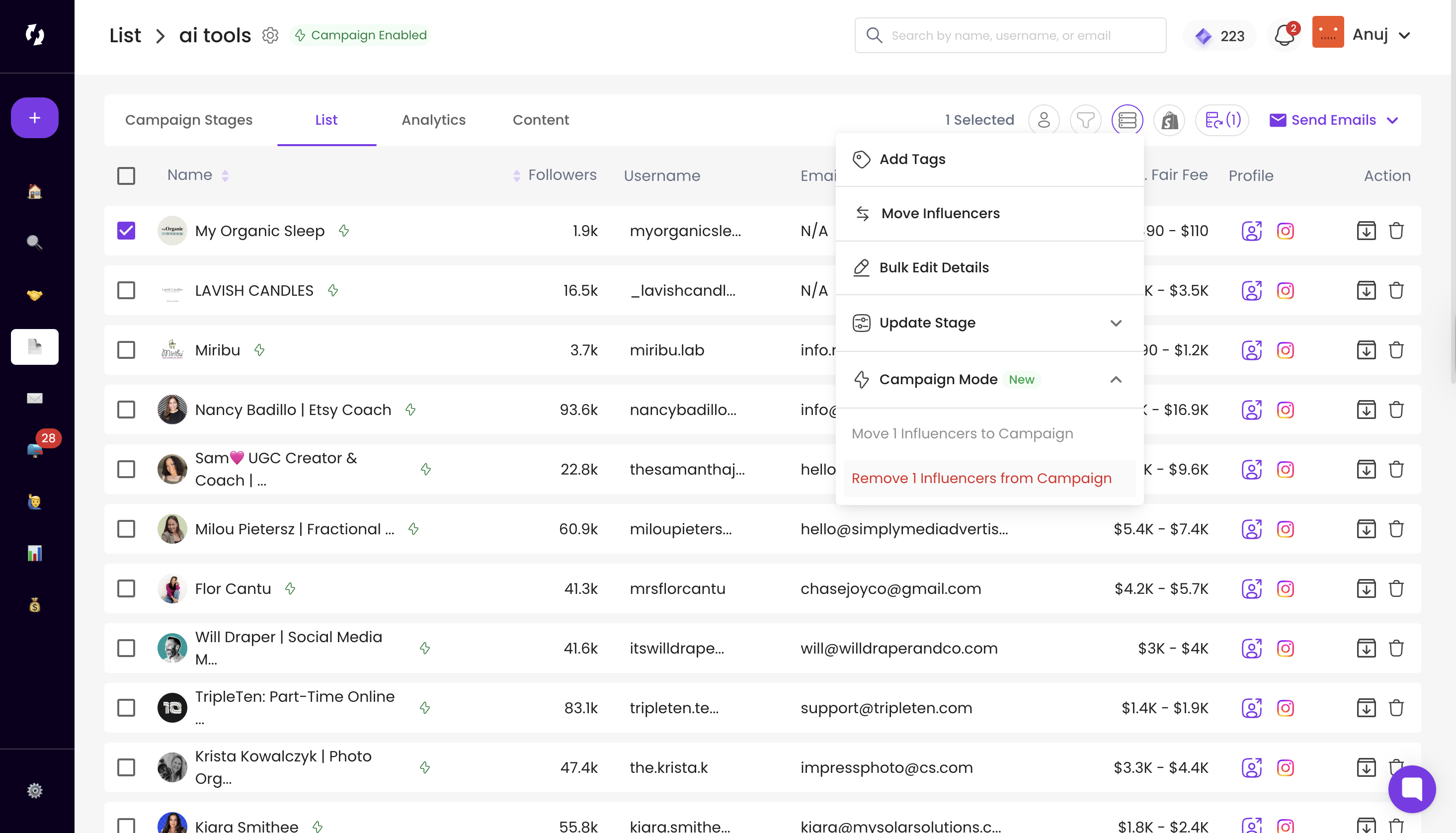From here, you can remove influencers from the campaign by selecting the influencer/s. Click on Bulk Actions —> Campaign Mode, and a dropdown opens with the option to remove the influencer/s.