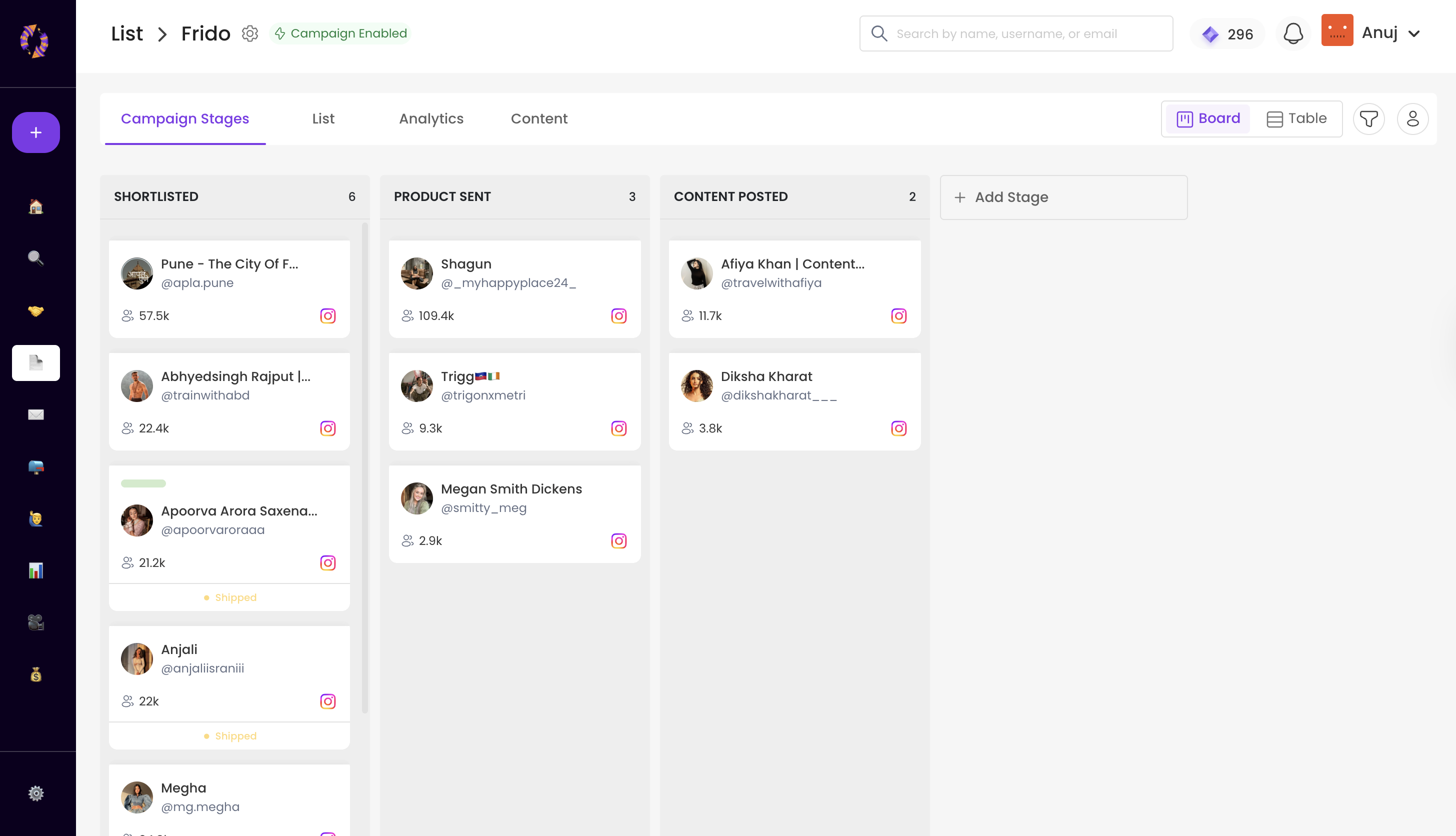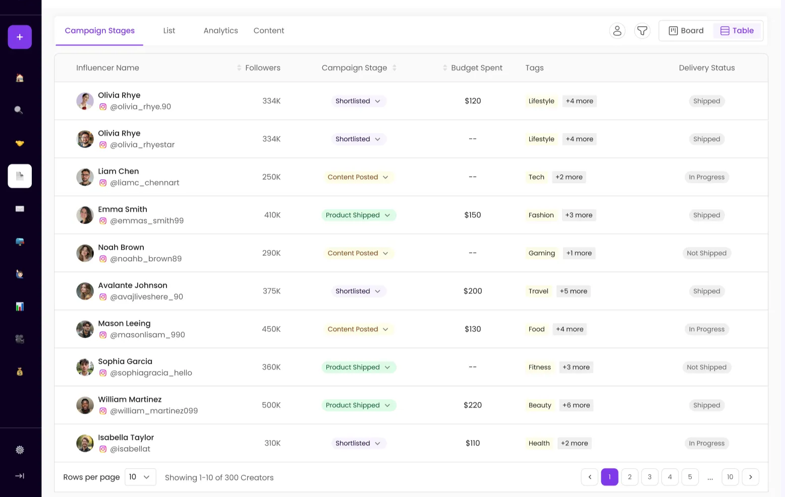 A Kanban-style board with all stages visible as seen in the image below. You can drag and drop influencers across stages or switch to Table View as per your preference.