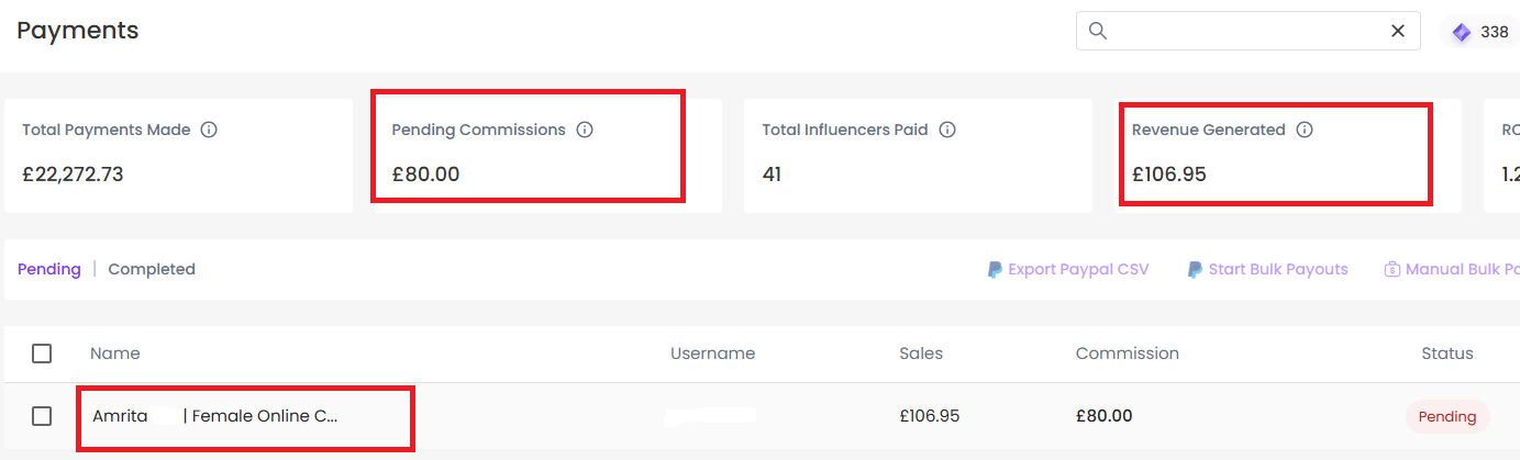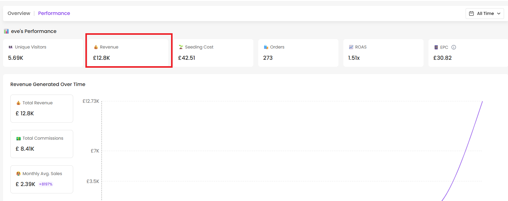 Best PracticeFor a complete and accurate view of total influencer-generated revenue and commissions, always refer to the Performance tab or the Dashboard.