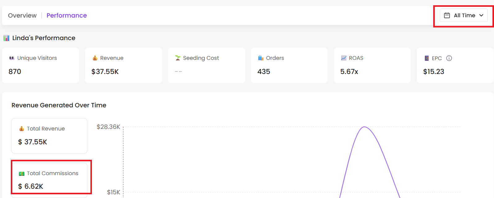 Unlike the Payments section, the Performance Page and the Influencer Dashboard both display all-time commissions basically, their lifetime earnings.