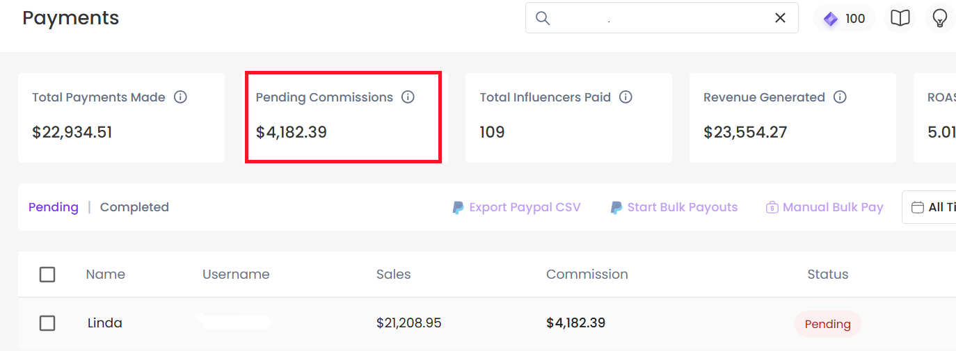 Best PracticesTo see an influencer’s total commissions or lifetime earnings, always check the Performance tab or the Dashboard. The Payments tab is best for tracking due commissions only.