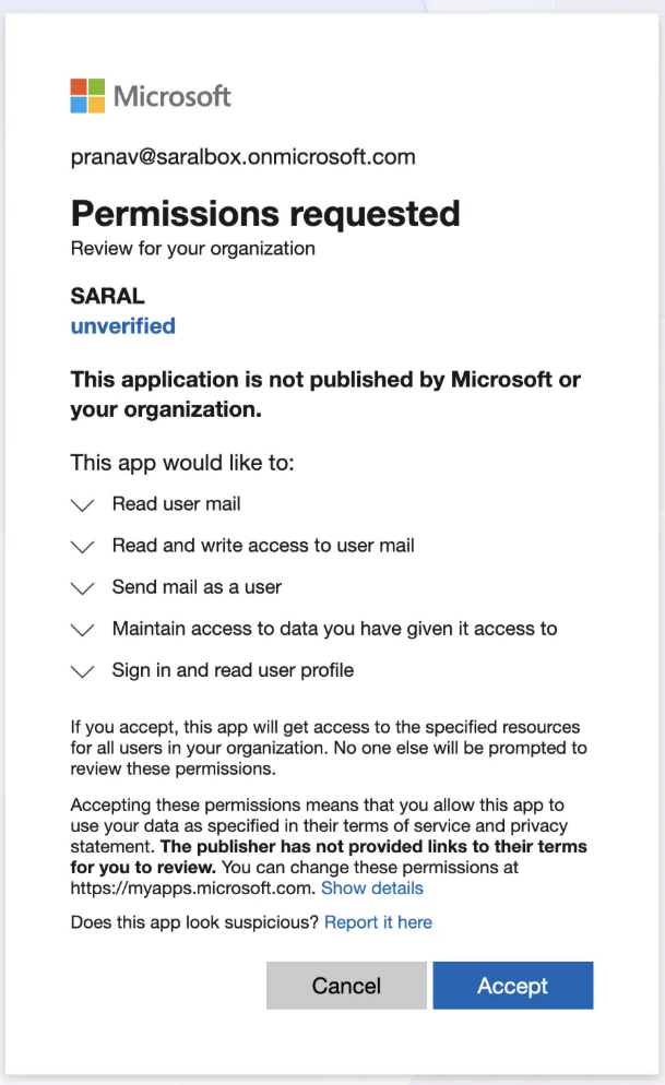 Note: During the admin setup, the “all users” access scope is required. This does not give SARAL access to all users — we only access accounts that explicitly connect after the admin step.